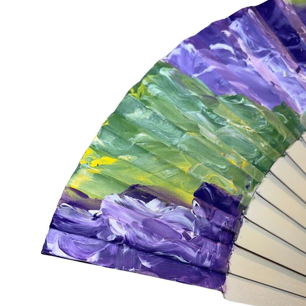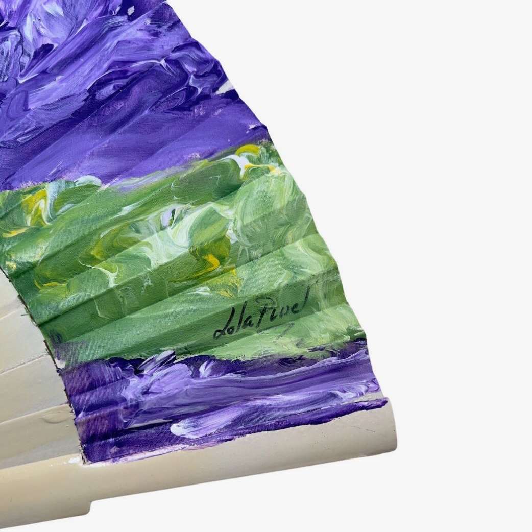 Abanico español de madera de pino y roble, pintado a mano, lijado y barnizado. Diseño exclusivo. Hecho por Lola Pinel. Tamaño medio pericón (27cm x 50cm abierto).
