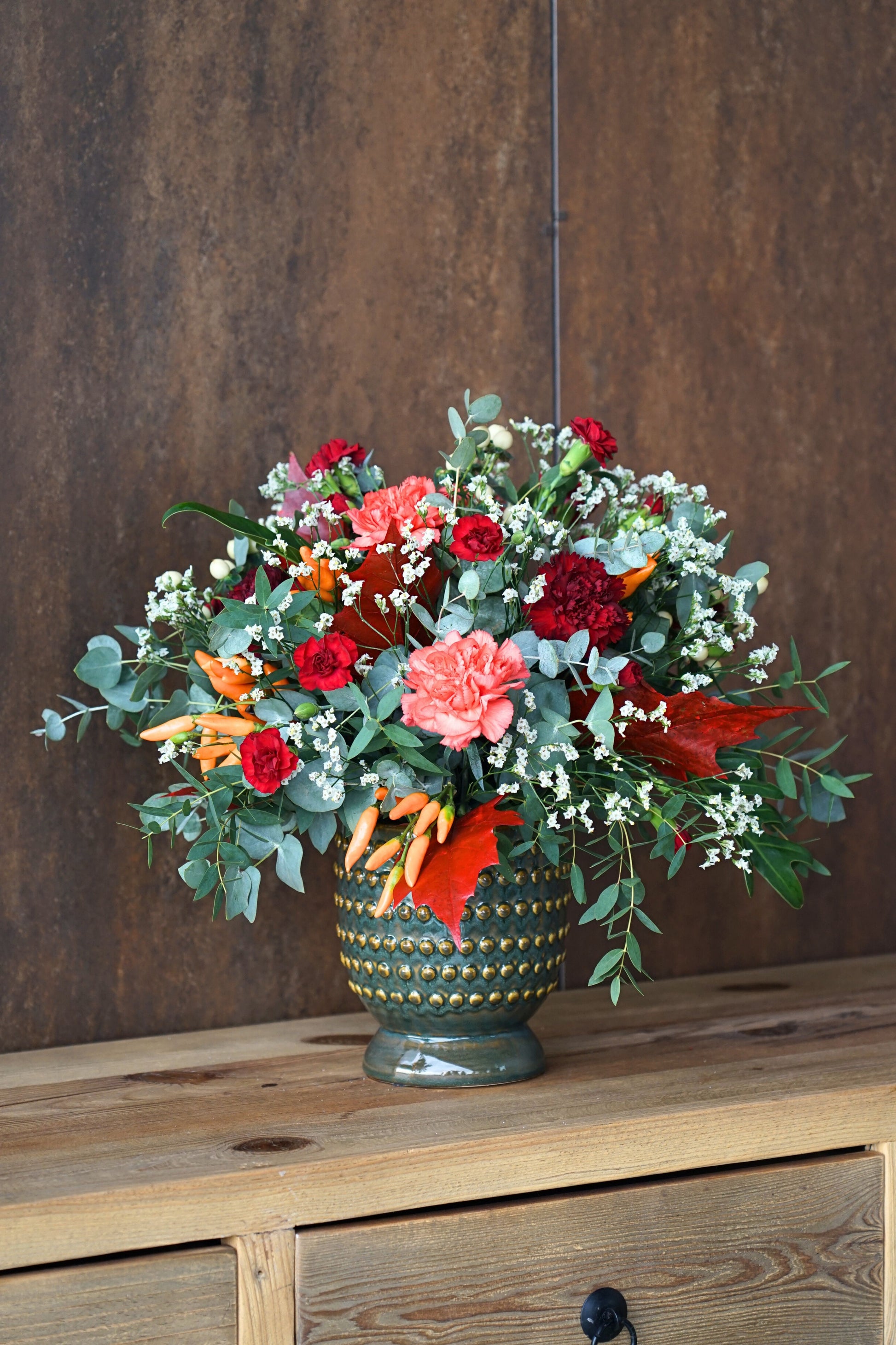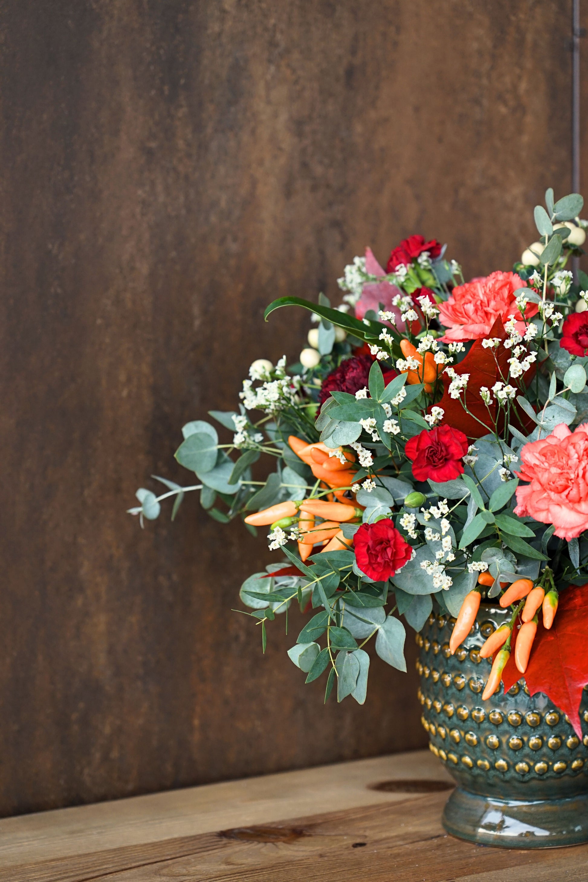 Arreglo de flores de temporada sobre pieza de cerámica.