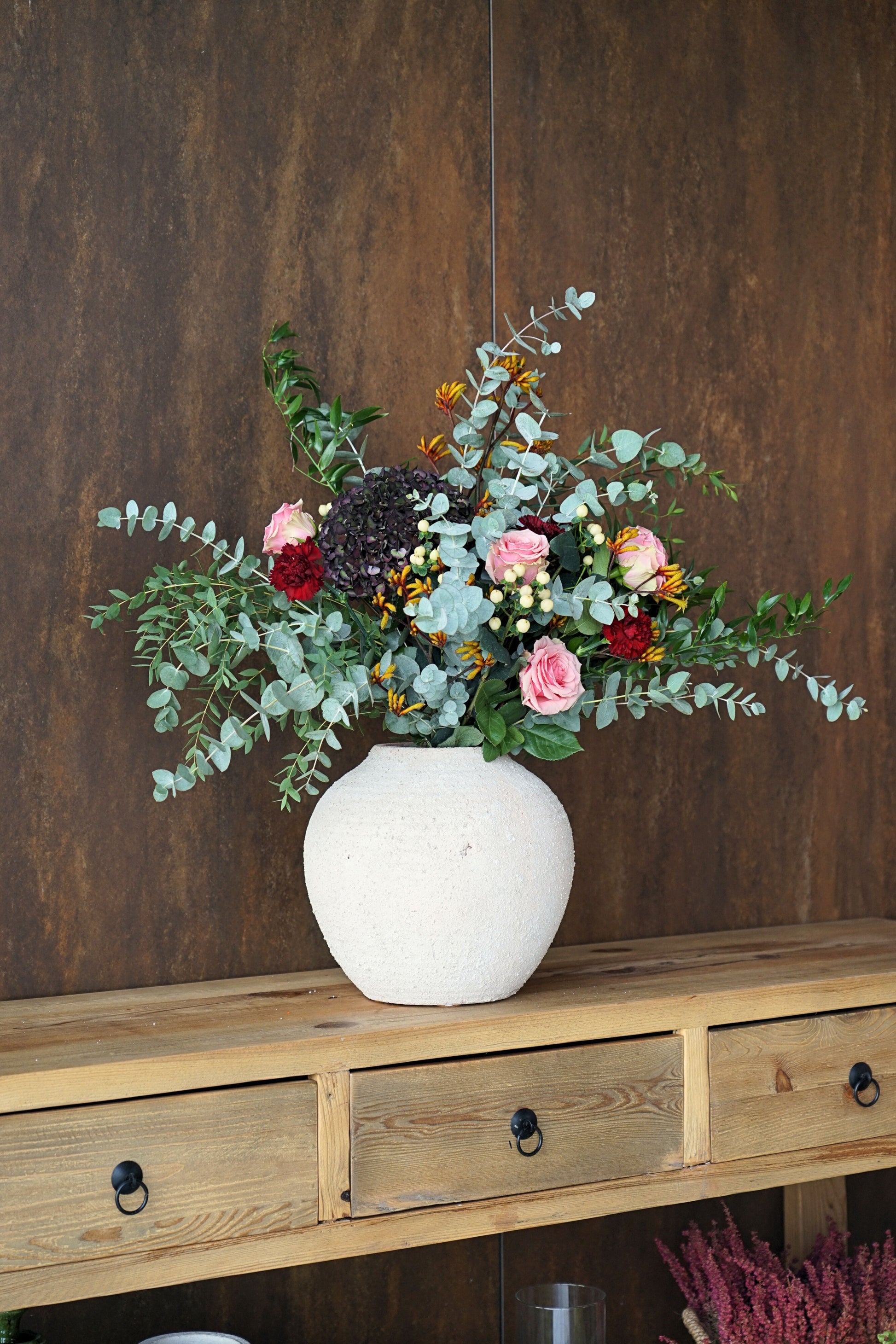 Una combinación de hortensia, rosas y flores de temporada. Su mezcla de texturas y tonos crea un equilibrio elegante y natural, ideal para regalar o para dar un toque especial a tu hogar.