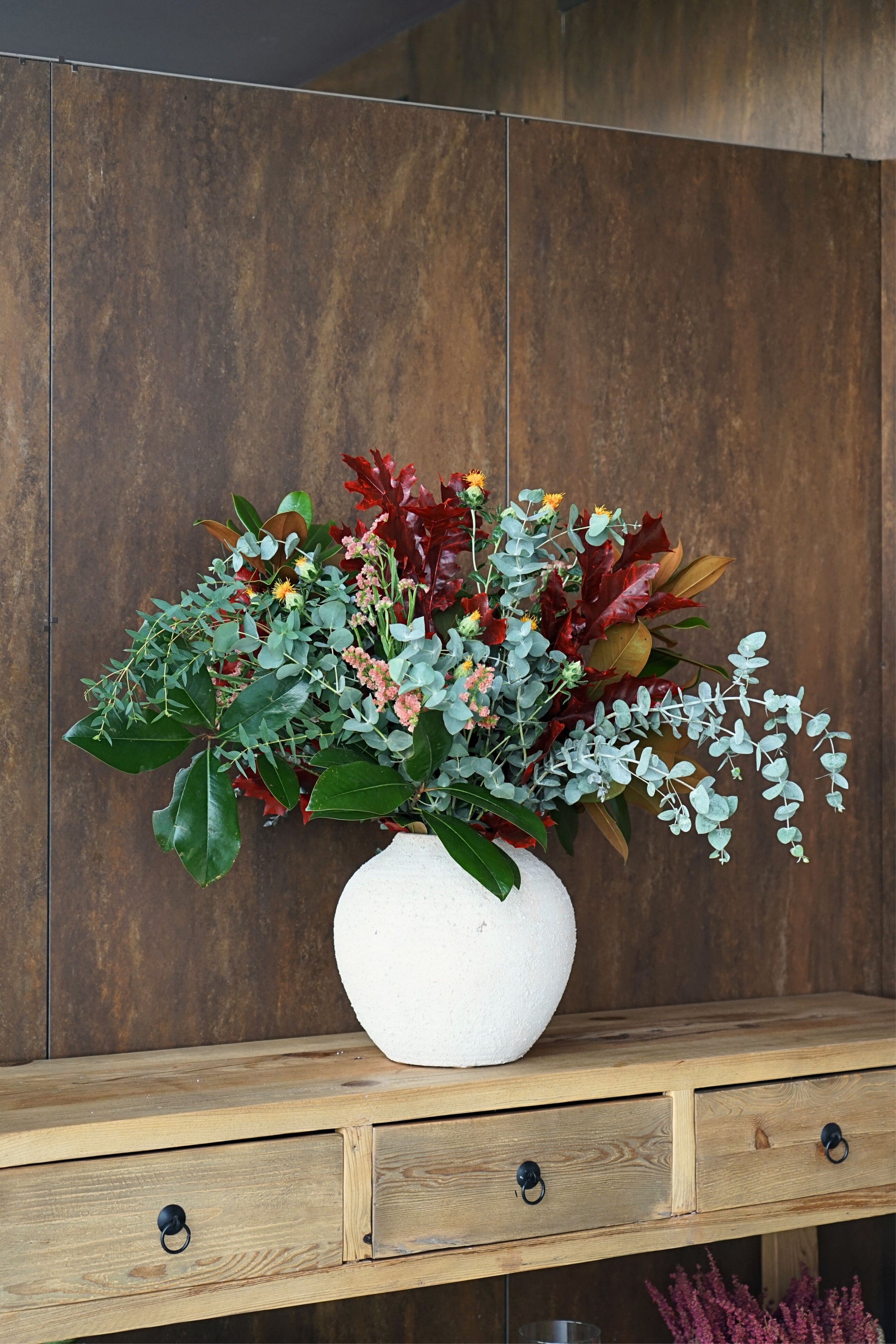 Una mezcla única de hojas y texturas de verdes de temporada que transmite elegancia en cada detalle.