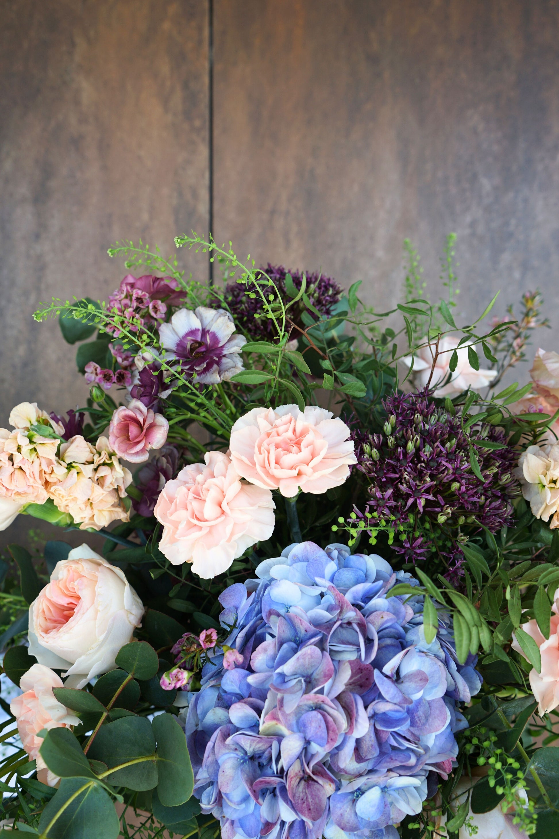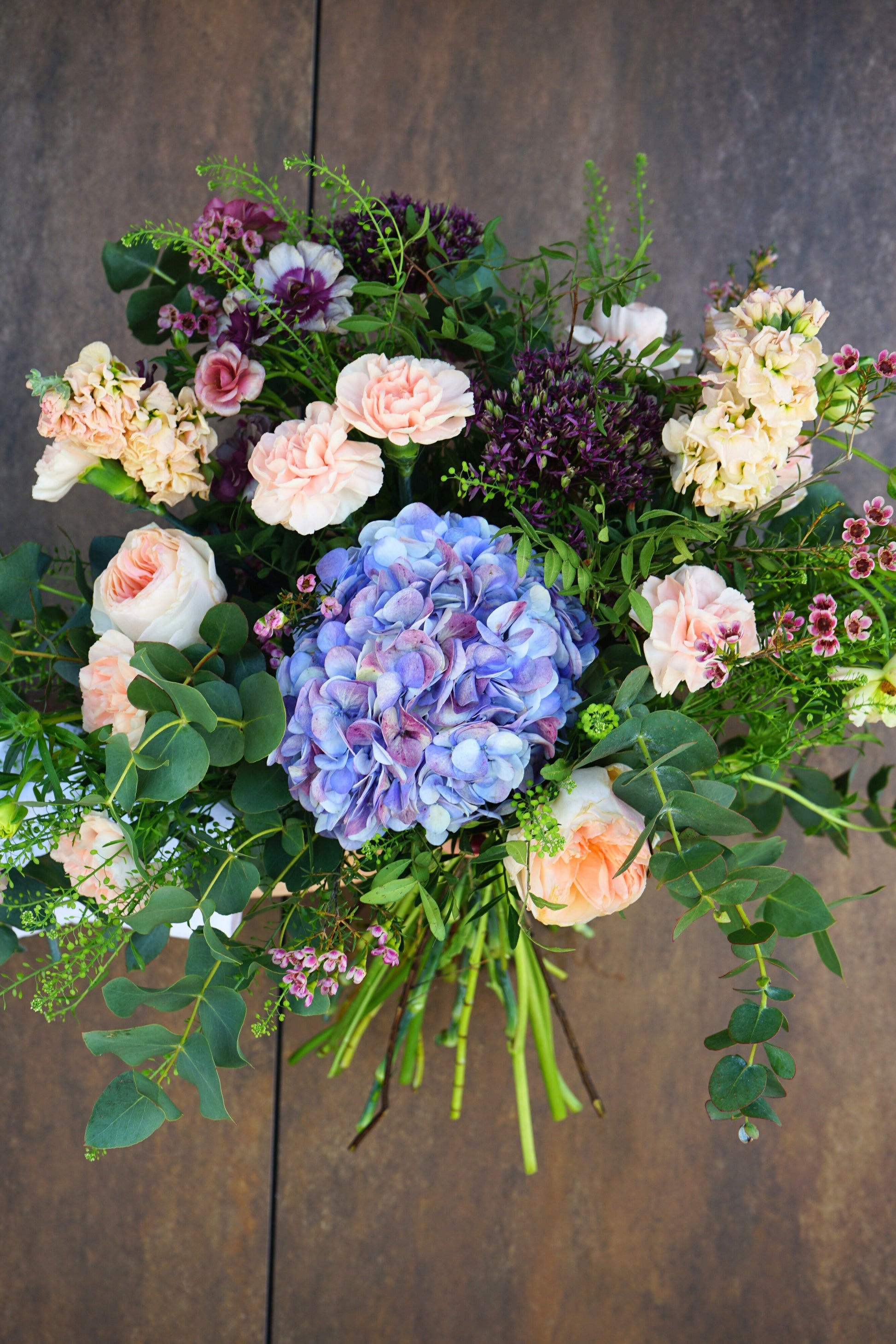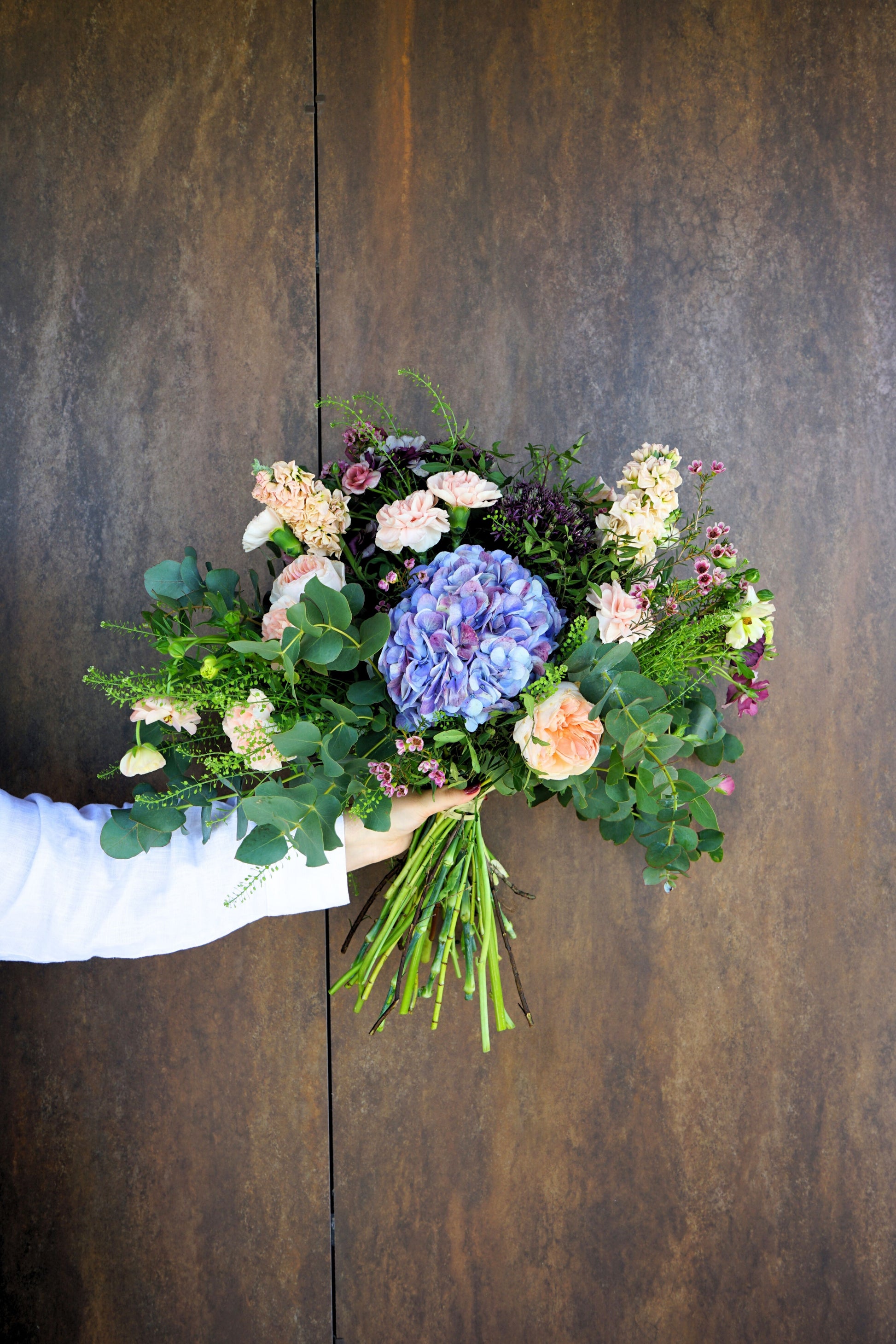 Ramo con flores de temporada y cama de verdes, cuidadosamente seleccionado en nuestro Atelier.